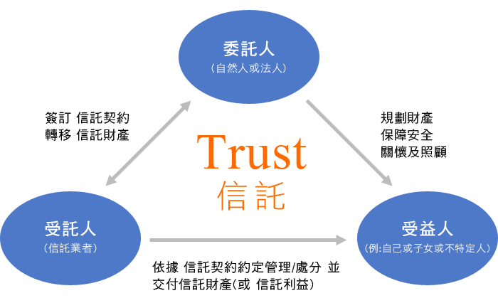 信託法第1條,「信託」為「委託人將財產權移轉或為其他處分,使受託人依信託本旨,為受益人之利益或為特定之目的,管理或處分信託財產之關係」;即是,透過「委託人」(提供財產的人)、「受託人」(信託業)及「受益人」(委託人想照顧的人)三個角色的連結,幫助有財產規劃需要的人,以更有效率而且安全的方式達到目標。委託人將財產權移轉給受託人後,受託人須依信託契約約定之信託目的為受益人之利益或特定目的管理或處分該筆財產,直到契約期滿或信託目的完成為止。